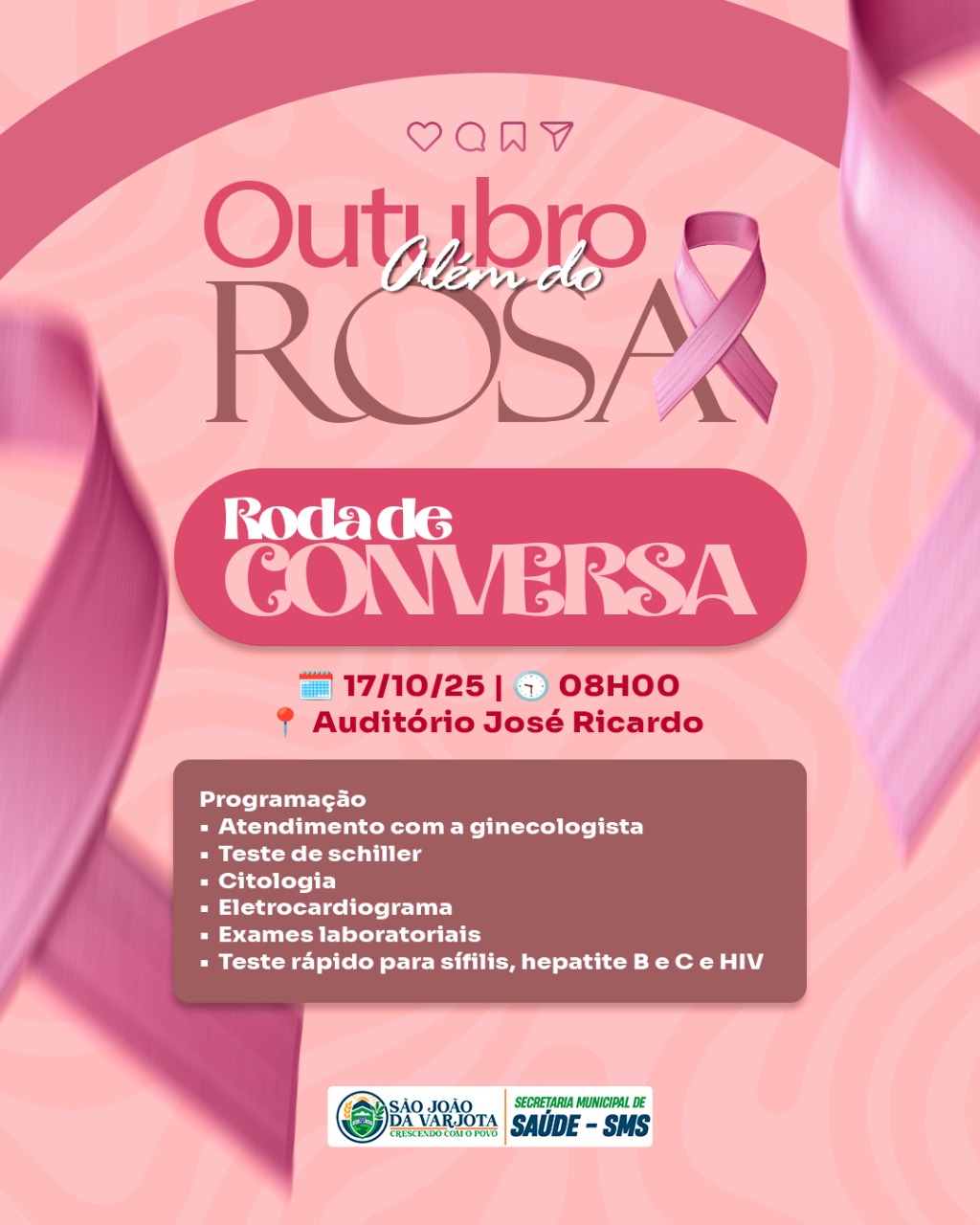 A Prefeitura de São João da Varjota, por meio da Secretaria Municipal de Saúde, convida todas as mulheres para participar da Roda de Conversa em alusão ao Outubro Rosa. 💗
