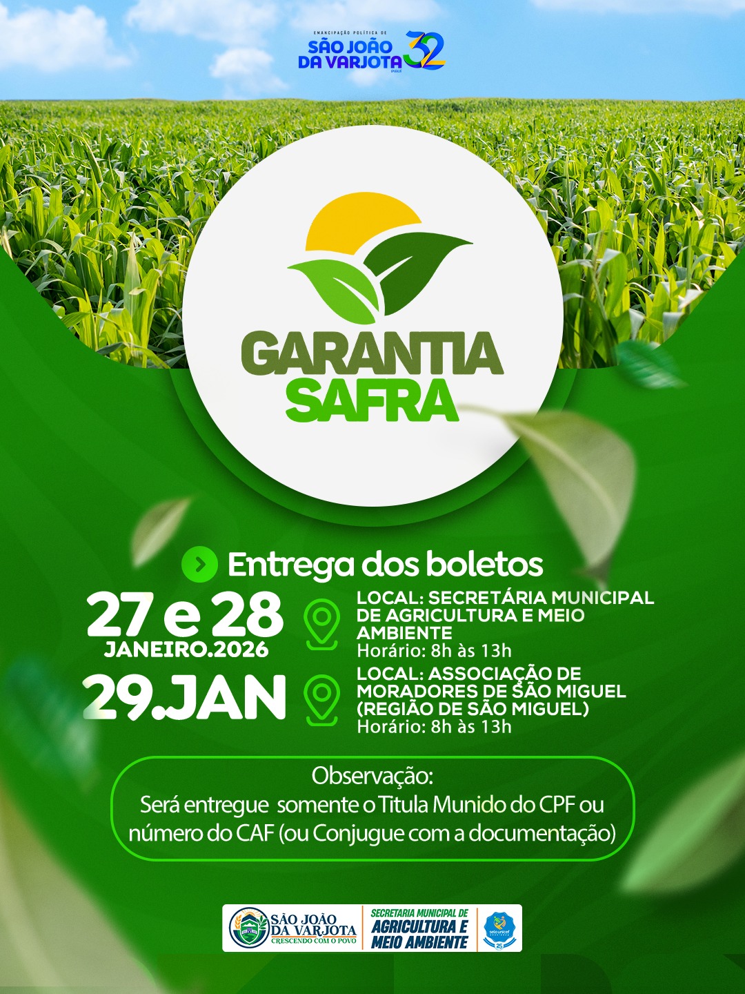 A Prefeitura Municipal de São João da Varjota, por meio da Secretaria Municipal de Agricultura e Meio Ambiente, informa aos agricultores cadastrados no Programa Garantia – Safra sobre a entrega dos boletos, conforme cronograma abaixo: