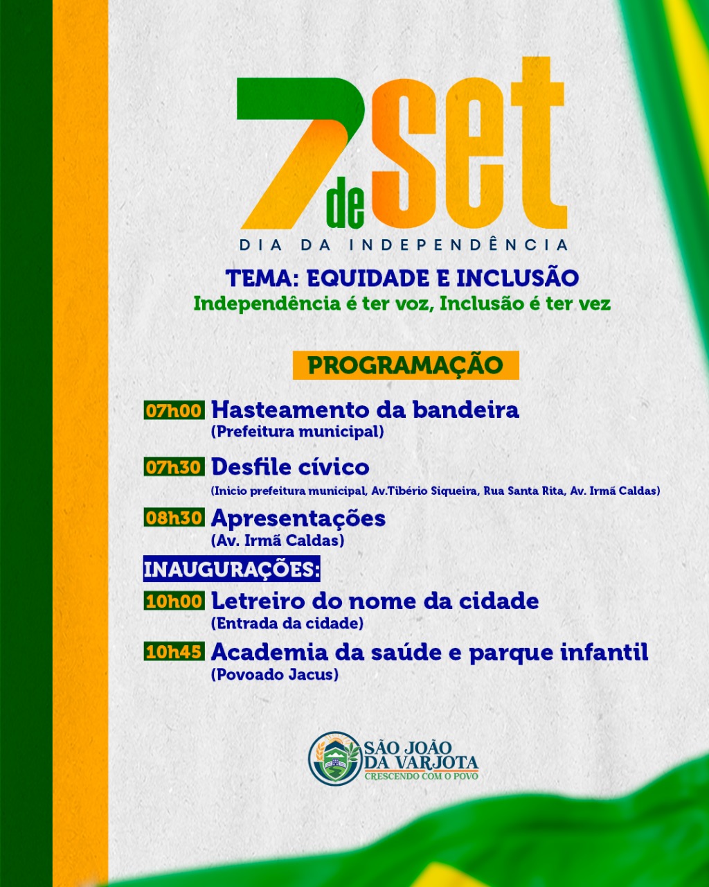 Com programação especial, desfile cívico, apresentações culturais e inaugurações, reafirmamos o compromisso de São João da Varjota com o respeito, a cidadania e o crescimento do nosso povo.
