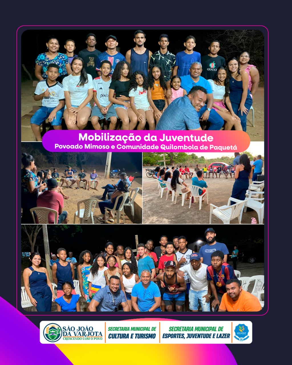 A Prefeitura Municipal de São João da Varjota, por meio da Secretaria Municipal de Cultura e Turismo e da Secretaria Municipal de Esportes, Juventude e Lazer, realizou na última sexta-feira (19/09), no Povoado Mimoso e na Comunidade Quilombola de Paquetá, o Encontro de Mobilização da Juventude, com foco na reativação do Conselho Municipal de Juventude.