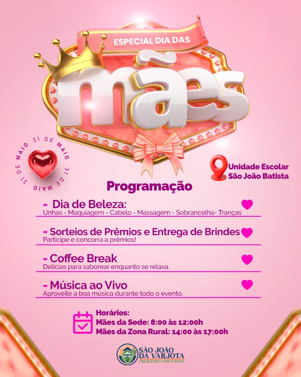 Venha celebrar o Dia das Mães com a gente! 🌸💖 Participe do nosso evento especial com um Dia de Beleza, sorteios de prêmios, coffee break e música ao vivo. Confira os horários e não perca essa oportunidade de divertir! 🎉👩👧👦 #DiaDasMães #SãoJoãoDaVarjota #EventoEspecial